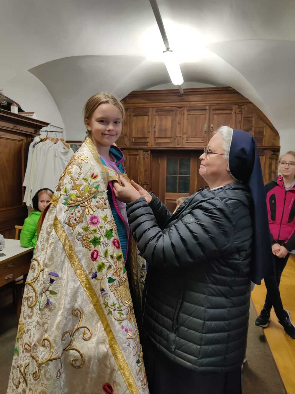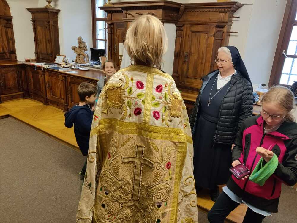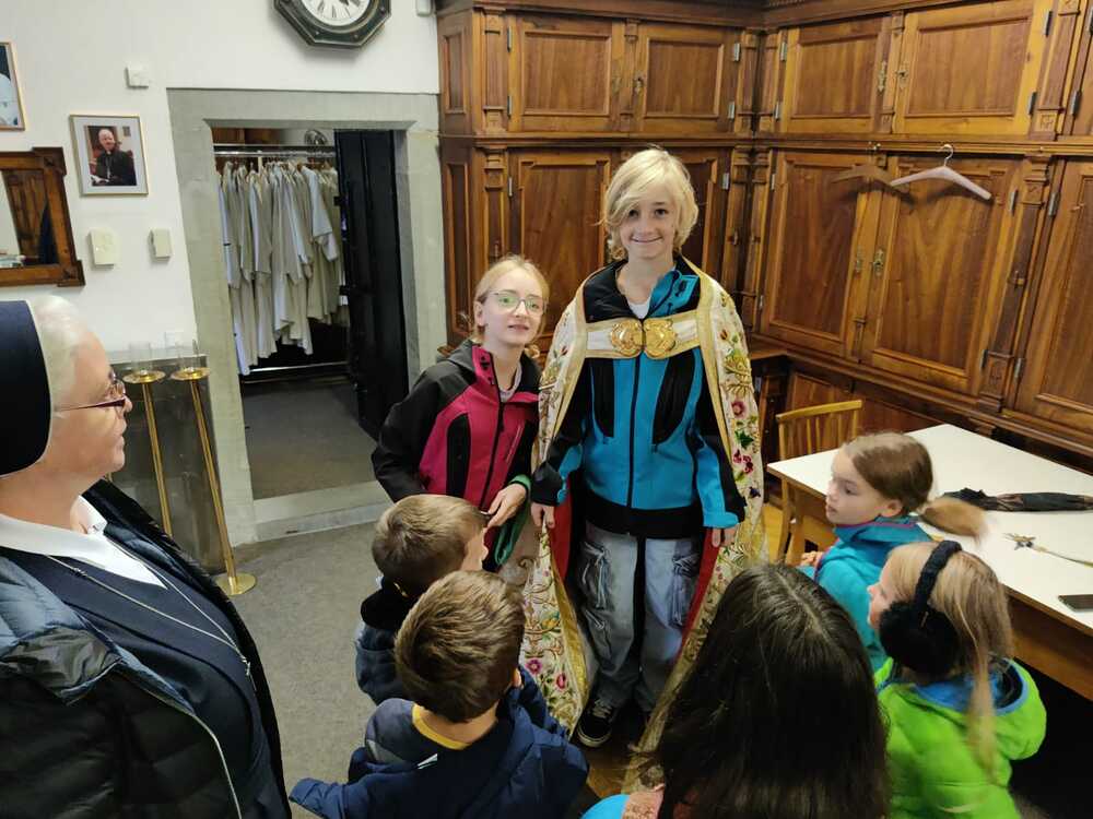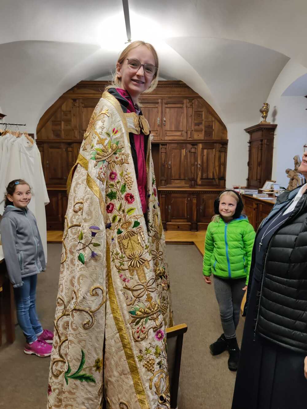 Zum Einstieg in das Thema zeigte Sr. Maria einen Film über das alte Handwerk des Brokatwebens. Anhand eines Pluviale - ein Mantel, der zum Beispiel bei der Fronleichnamsprozession getragen wird - konnten die Kinder dann den gewobenen Stoff und auch die Stickereien, Spitzen, Knöpfe und Verzierungen bewunden. Und den Mantel natürlich auch anprbieren. Bei so einem reich verzierten Gewand kommt einiges an Gewicht zusammen.