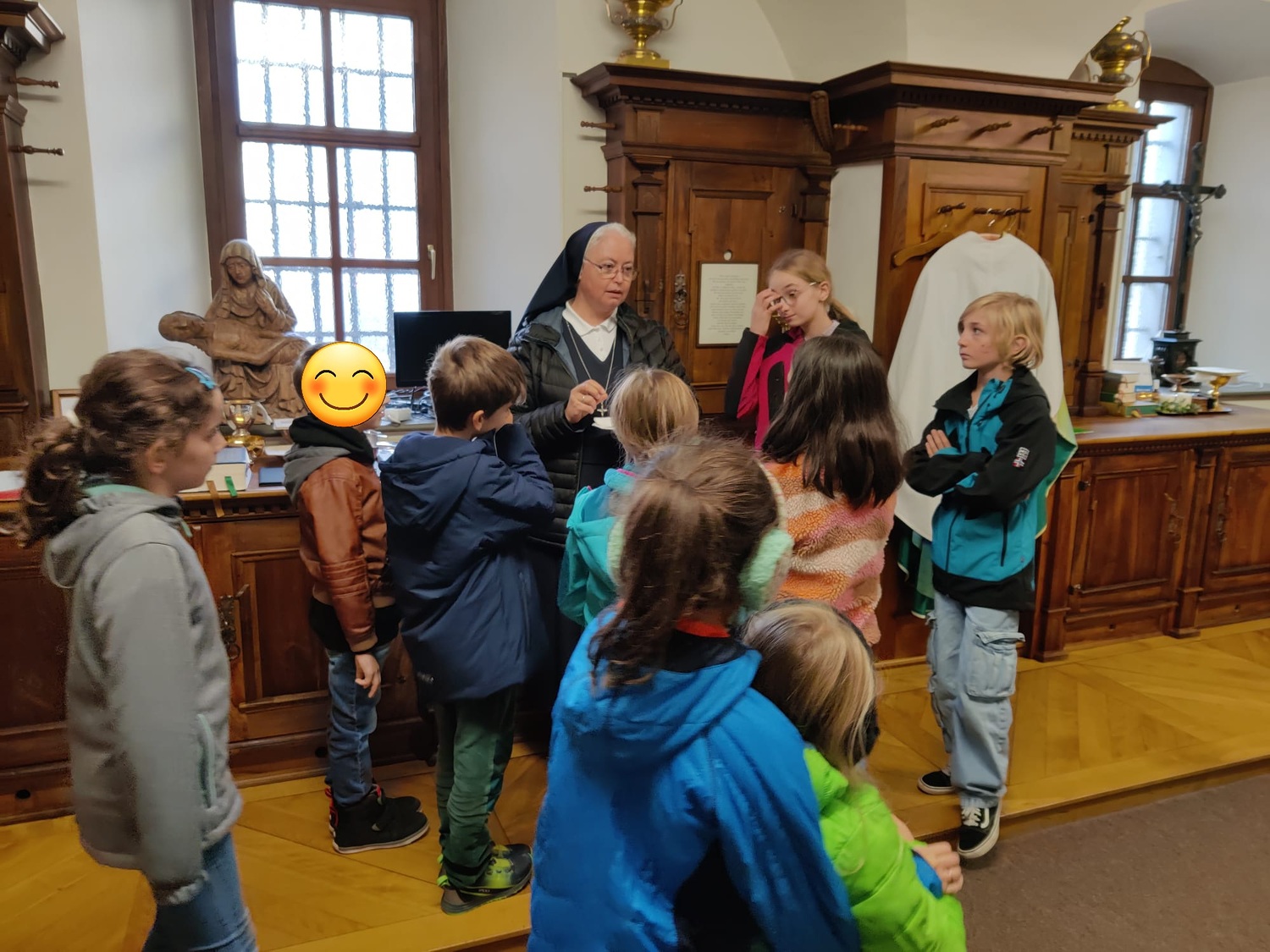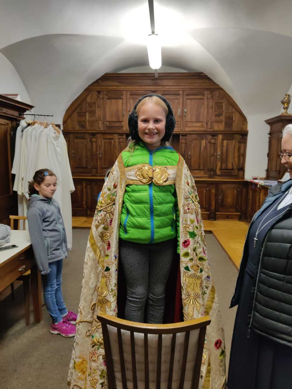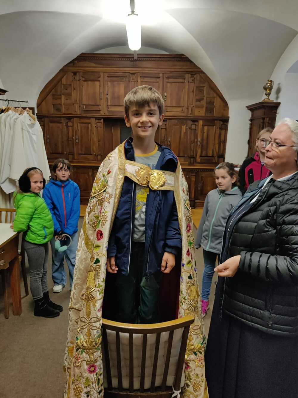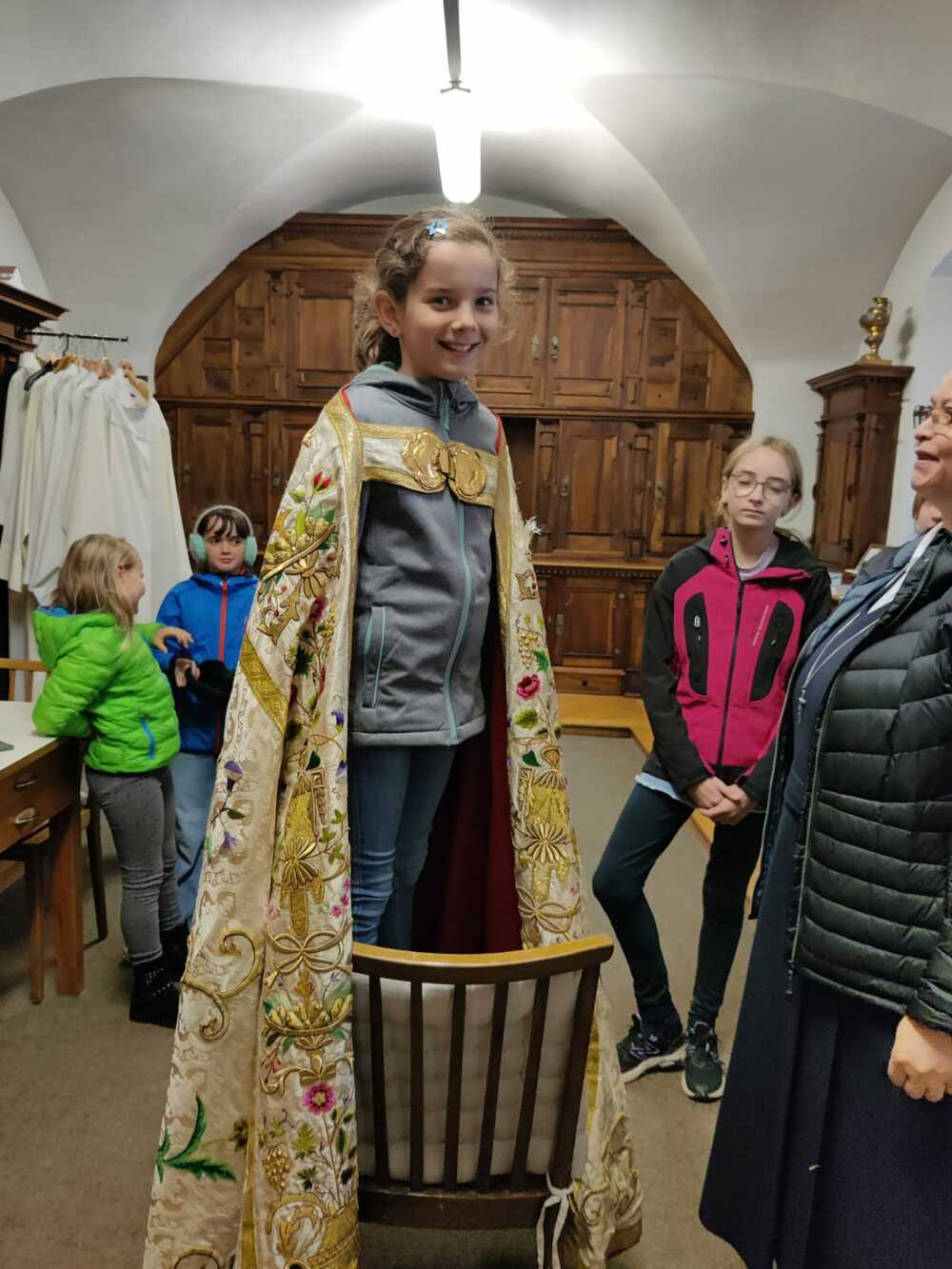 Zum Einstieg in das Thema zeigte Sr. Maria einen Film über das alte Handwerk des Brokatwebens. Anhand eines Pluviale - ein Mantel, der zum Beispiel bei der Fronleichnamsprozession getragen wird - konnten die Kinder dann den gewobenen Stoff und auch die Stickereien, Spitzen, Knöpfe und Verzierungen bewunden. Und den Mantel natürlich auch anprbieren. Bei so einem reich verzierten Gewand kommt einiges an Gewicht zusammen.