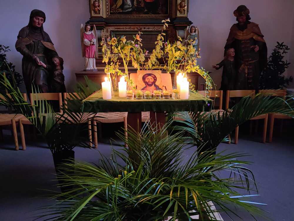 Die Kinder haben den Weg zum Altar zuerst mit bunten Tüchern und Palmzweigen geschmückt und dann alles ganz schnell auf die Seite geräumt und ein schwarzes Tuch mit einer einsamen Kerze – ein Zeichen für Jesus – in die Mitte gelegt.