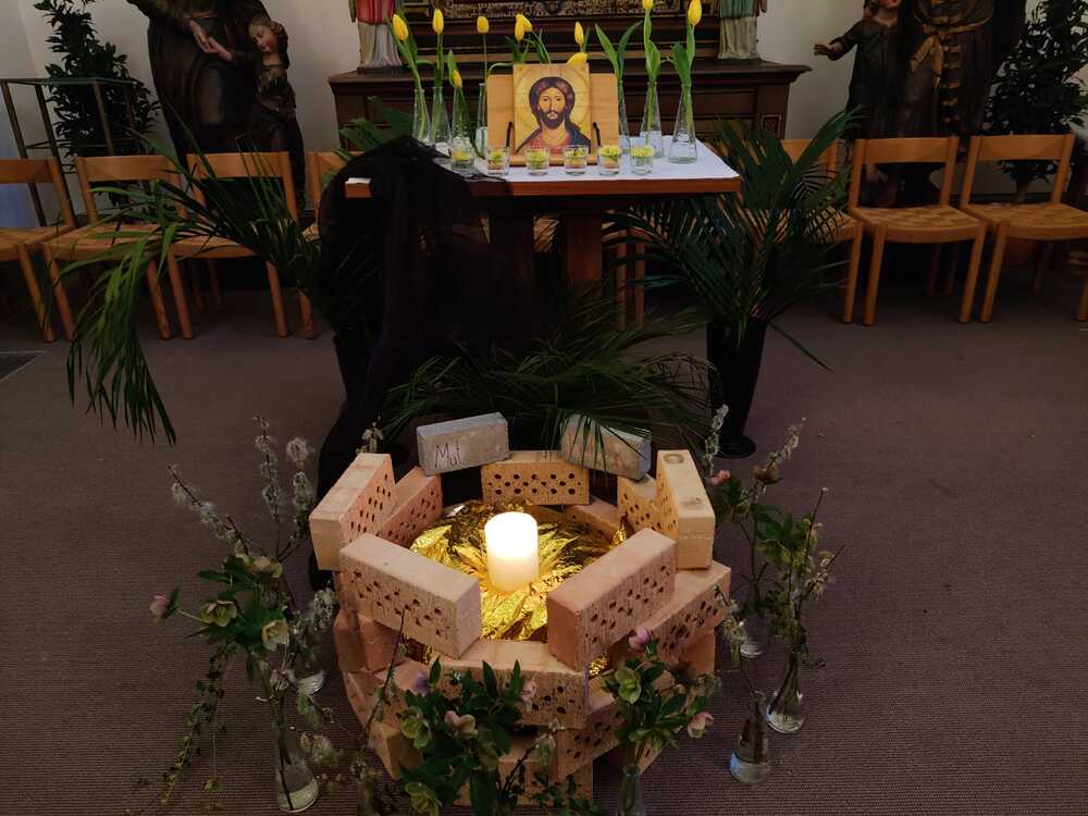 Am Freitag haben wir Jesus im Garten abgeholt und haben ihn auf seinem schweren Weg, dem Kreuzweg, begleitet. Denn gerade, wenn es schwer wird, ist es wichtig, dass man nicht alleine ist. Wir sind bis zu seinem Tod bei Jesus geblieben und haben ihn ins Grab gelegt und dieses Grab mit Blumen geschmückt.