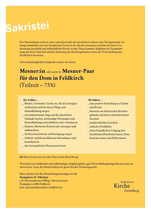 Mesner:in gesucht Wir suchen einen Mesner, eine Mesnerin oder ein Mesnerpaar und freuen uns auf eure Bewerbungen. Mehr lesen