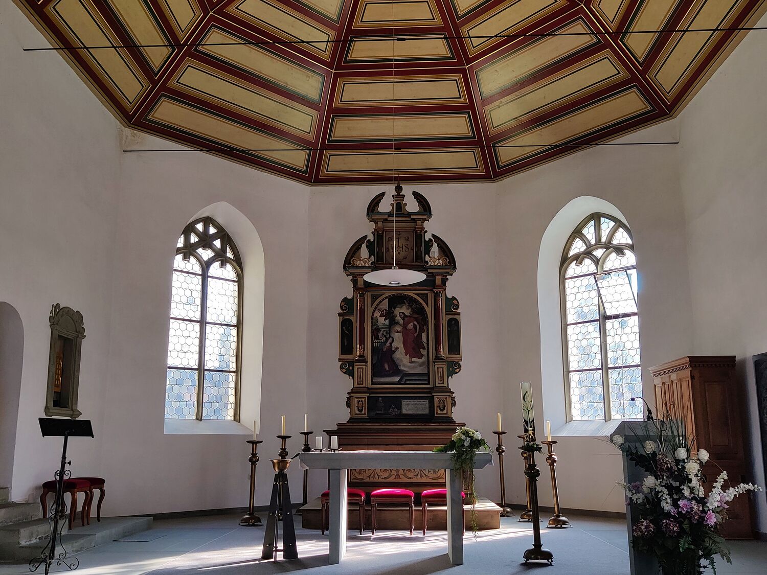 Von Dekan Maurer wurde noch ein einfacher, sehr schöner Altartisch aus Sandstein in den Chorraum gestellt. Wir haben diesen Altar gereinigt und einen dazu entsprechenden Ambo fertigen lassen. Im Chorraum befindet sich auch ein Sakramentshäuschen aus dem Jahr 1555, das sehr gut in dieses Ensemble einfügt.