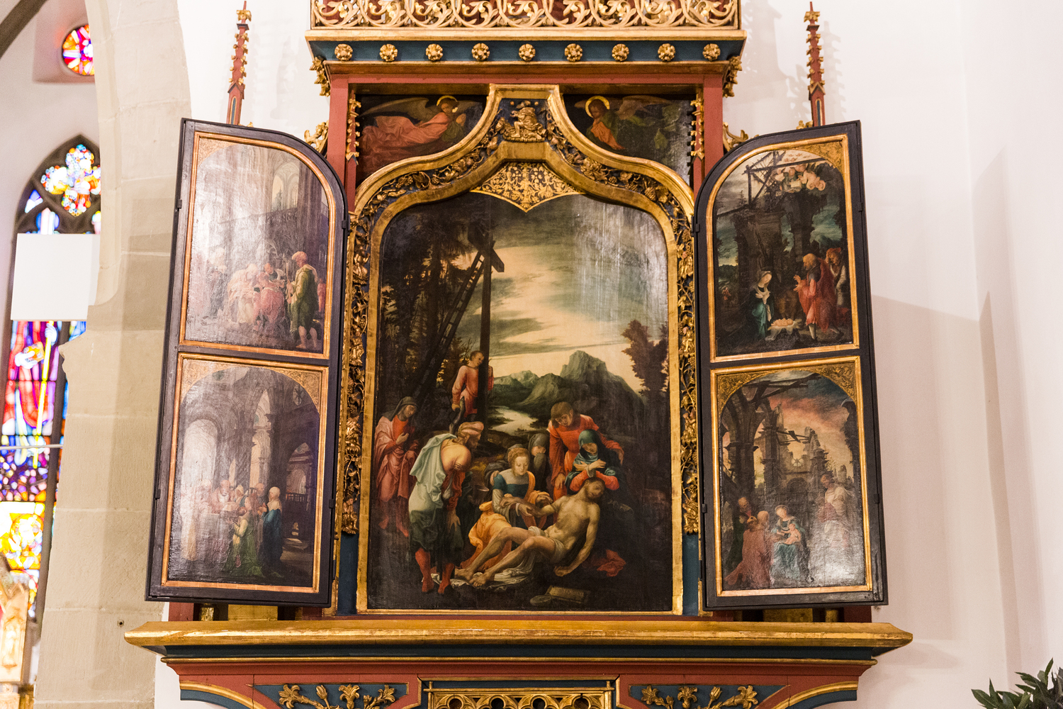 Das große Beweinungsbild im Zentrum des Altares ist von Wolf Huber signiert und 1521 datiert. Er malte die Kreuzabnahme in die Landschaft von Feldkirch, um anzudeuten, dass das, was damals in Jerusalem geschah, auch hier und heute geschieht. Neben den biblischen Figuren steht ein unbekannter Betrachter, der jeden Betrachtenden in das Geschehene miteinbezieht. Die leuchtenden Gewänder in den dem Maler eigenen Farben orange-gelb, grün, türkis und krapprot stehen in drastischem Kontrast zu der Düsternis der Landschaft, die den Ernst des Geschehens widerspiegelt. Das Kreuz durchbricht die verschiedenen Horizonte und ragt über diese hinaus. Es weist einem leuchtenden Lichtweg der Erlösung die Richtung. Der originale geschnitzte Rahmen birgt, in Weinranken verschlungen, elf Figürchen der Vorfahren Christi.