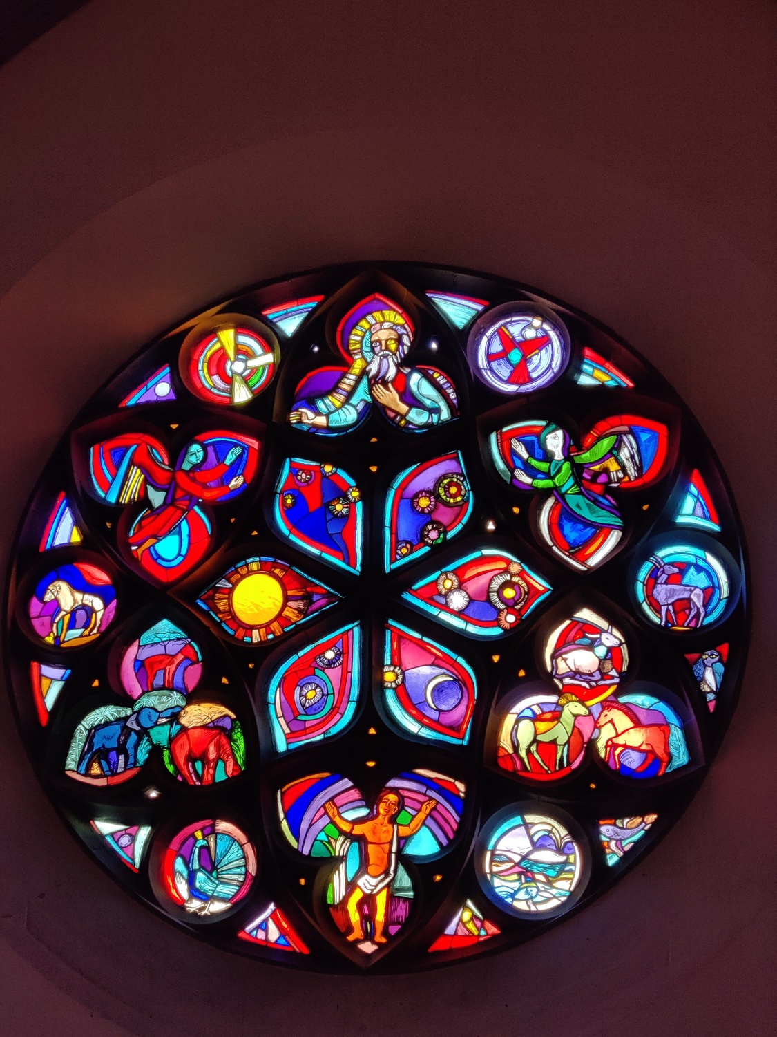 The first long window demonstrates the expulsion from paradise; the luminescent part depicts the Immaculate Conception, reminiscent of hope and contrasting the surrounding darker, blue panels. The middle long window contains god’s mercy through sending his son as redemption, whose work is told through eight miracles.