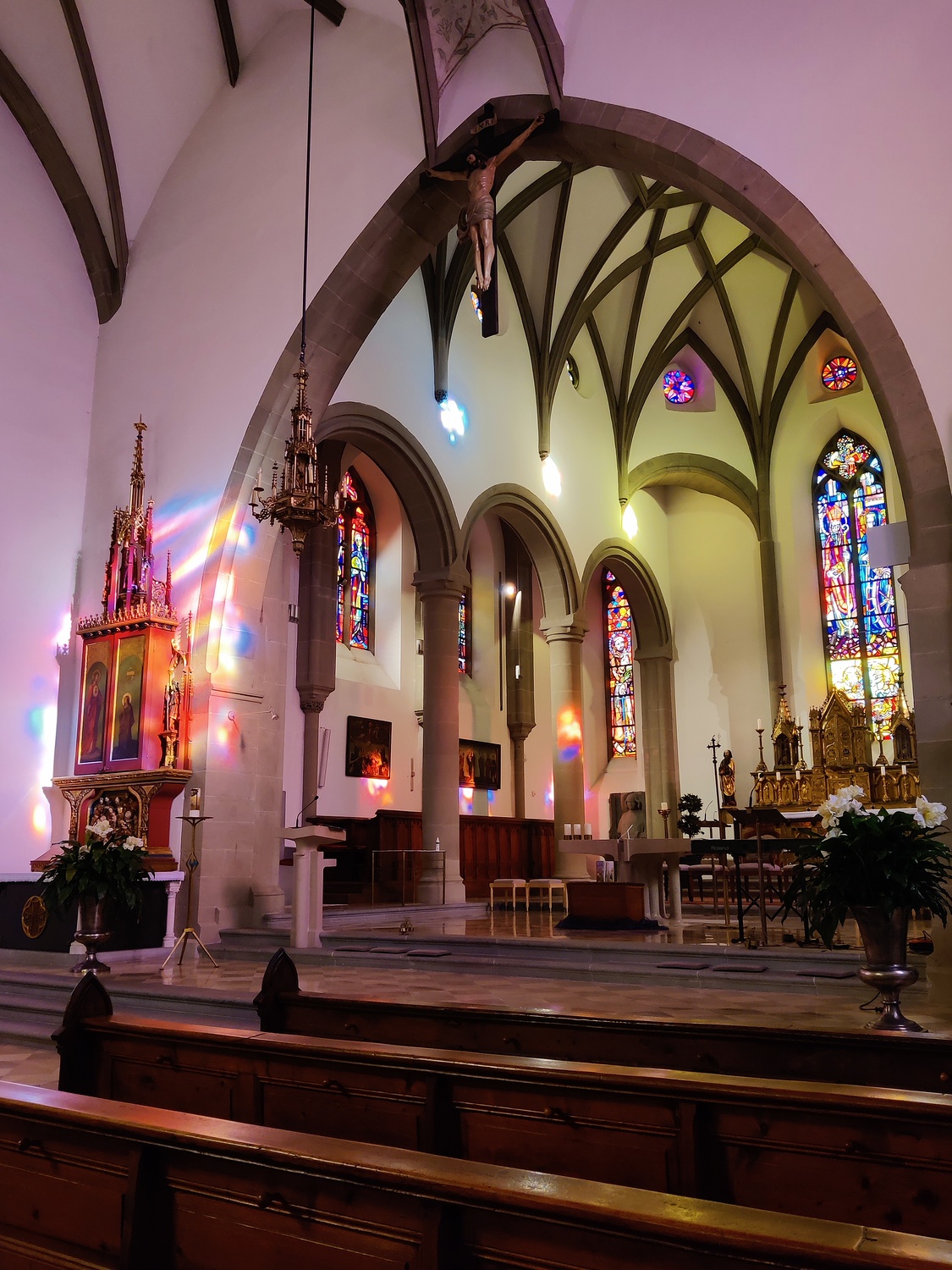 When entering the church, the spatial impression is overwhelming. The eight slim rib ridges unfurl from high, slender sand stone pillars without disruption through their capitals and form a big, protective parasol or palm tree above the room of the main hall. The contrast between the almost white walls and vault fields and the grey stone pillars and buttresses adds sacral seriousness to the filigree urge for heights of the delicate gothic construct. The luscious and glowing colours of the windows liven up the room through ever changing dancing colours.