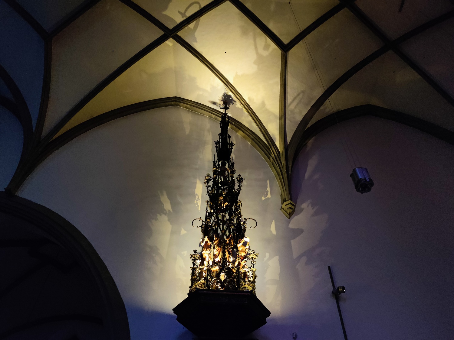 The pulpit was once an aumbry and erected in 1523 for the choir. On a stone foot shaped like a six-stranded star raises an iron pillar with round bars and golden ornaments on a dark surface. Upon lies the hexagonal pulpit basket, decorated with buttresses and foliage ornaments. The wooden sound cover with early baroque ornaments was added to the pulpit during the conversion in the middle of the 17th century. The entire extension of wrought iron belonged to the aumbry. It is decorated richly with lashes and crucifers. There are ten wooden figures implemented in the structure that symbolise the manna culling. During the restoration of 1961, the pulpit was moved to its current position from the south western wall, it was also blue, red and gold originally. The blueprint for this pulpit is archived in the cathedral museum in Freiburg and was the prime sample for aumbries in south Germany. It also contained the gothic silver monstrance from 1506, which doctor and geographic Hieronymus Münzer from Nürnberg donated to the parish of his hometown Feldkirch.